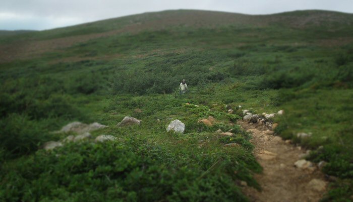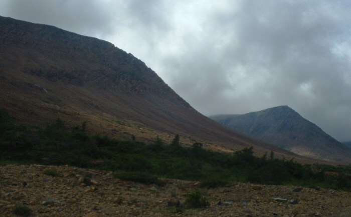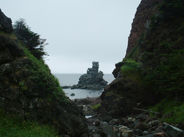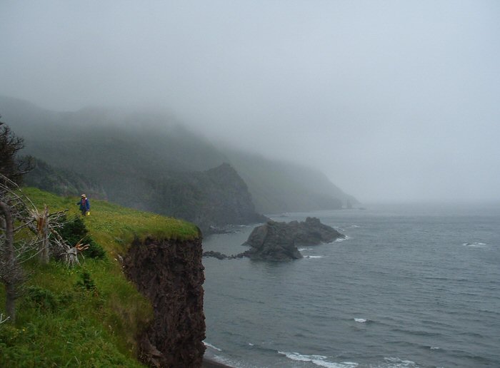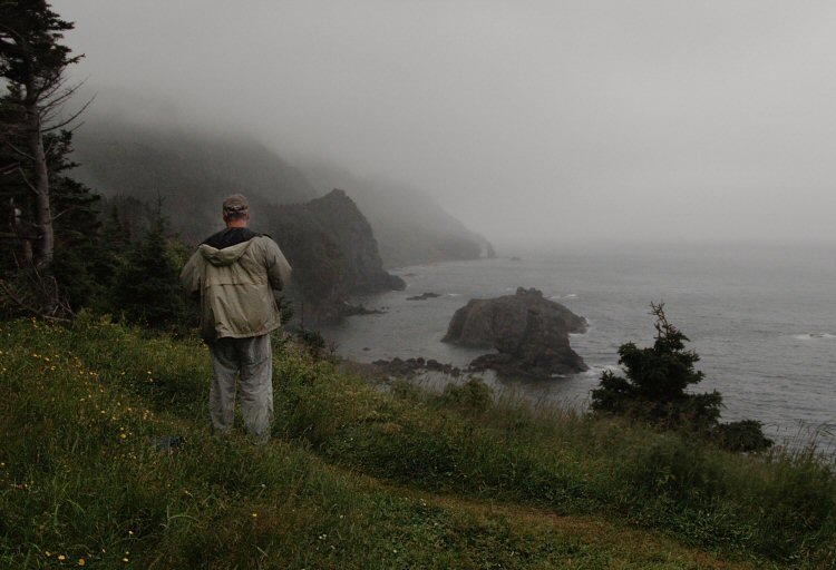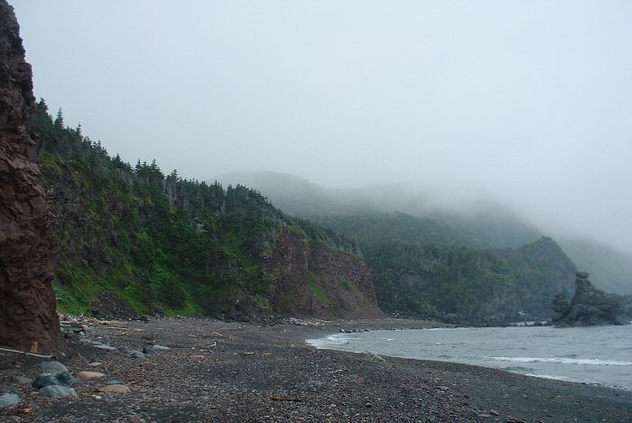 Our first paddling day at Gros Morne began with high winds. We'd hoped to paddle out to the seastacks and caves of the Trout River area. When we got there it was clear that we wouldn't be able to kayak that day. So we found a hiking trail that went to that part of the coast instead. It was misty and windy and wet. We started hiking across the Tablelands, a geological area formed when part of the earth's mantle - normally 6 miles under the earth's crust - rose and broke to the surface. It was made mostly of iron, chromium and nickel. Almost nothing could grow on the rust-colored rock. It was vast barren land.