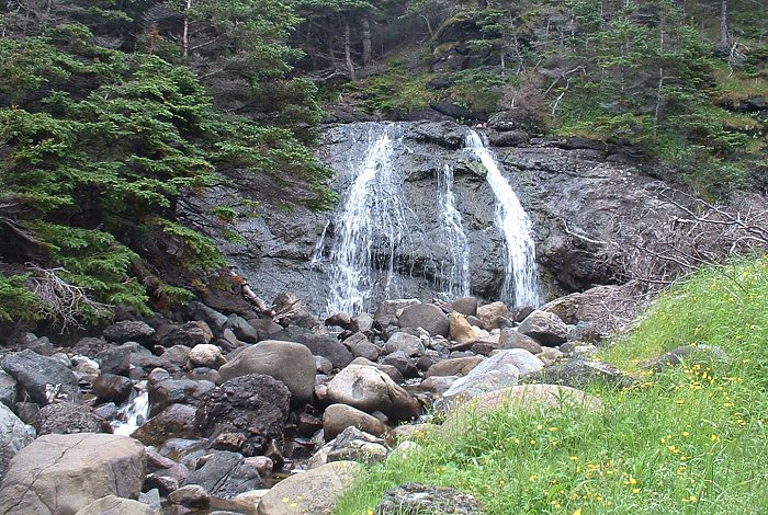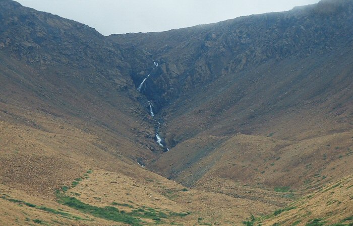 High up on the Tablelands there were still snowfields with waterfalls cascading down from them. This waterfall was at least 200 feet long.