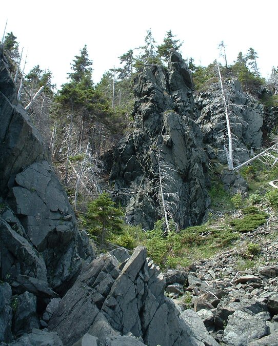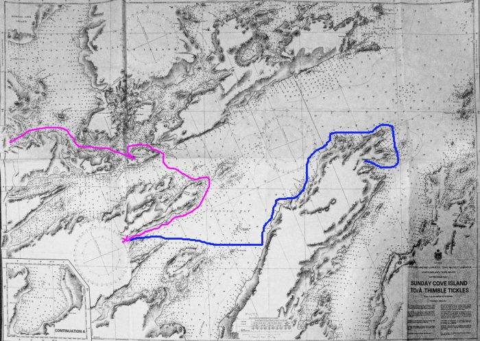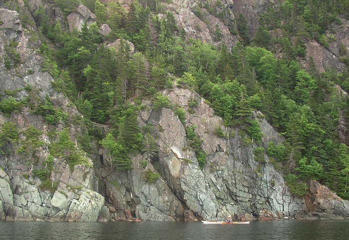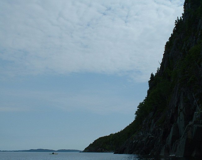Our route on this day was to cross Seal Bay, travel along the cliffs, round Thimble Tickle Head, and camp in the cove at Thimble Tickle - 12.32 miles. Funny names here - a tickle is a place where the water is pinched in between two land masses.