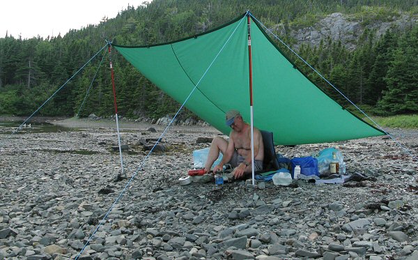 Here is Mark's first tarp kitchen set-up. It kept the sun off us and sheltered us from wind. Mark made popcorn and brownies. Insects were not as bad at this location, but they still loved the back of my neck - I had dozens of bites.