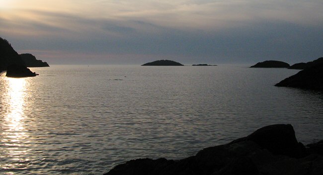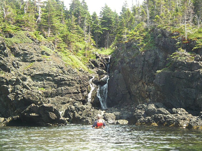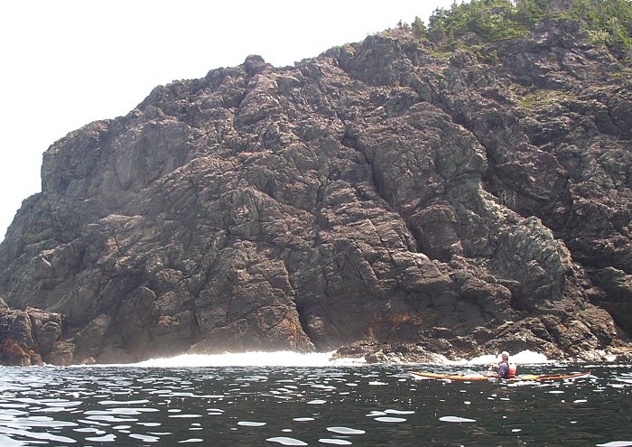 We paddled through Leading Tickles, through a maze of islands, and did a several-mile crossing of New Bay to reach the headlands. From here it was open ocean on one side, sheer rock cliff on the other. There was no landing area on the headlands except for Fortune Bay, some five miles along the coast. This was a committed paddle, only to be attempted in good weather. We were lucky to have calm seas and a gentle tailwind.