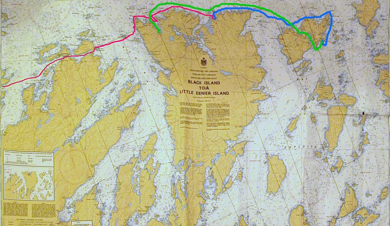 The marine forecast in Newfoundland was pretty minimal. We could pick up a general northeast coast forecast (hundreds of miles, like forecasting for all of New England) for wind speed and direction. No mention was made of wave height or weather. ("Newf-LAND m'rine forecast. Northeast coast. Monday. Winds s'west one-five to two-oh knots, increasing to two-five afternoon.") So we had little to go on. The forecast was for one more day of fair weather and then a protracted period of high winds. We thought it best to cut short our stay at the Bay of Exploits and get back across the headlands before the wind kicked up. After feeling somewhat better I had been sick again the night before, unable to keep food down, and was not at all sure I could handle a long committed crossing. We talked about alternatives. Ultimately, I used Mark's spare paddle to give me extra paddling power, and we set off.