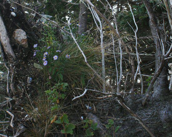 Autumn asters growing in an uprooted tree on Gooseberry Island.