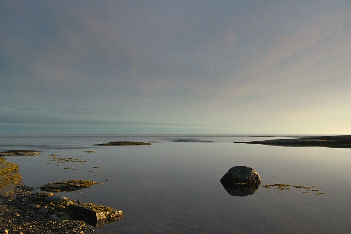 Now the sky is clear. I walked the shore to explore some small monoliths. They weather differently than granite, flaking rather than wearing smooth. The surface looks like daubs of clay.