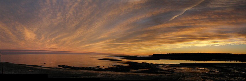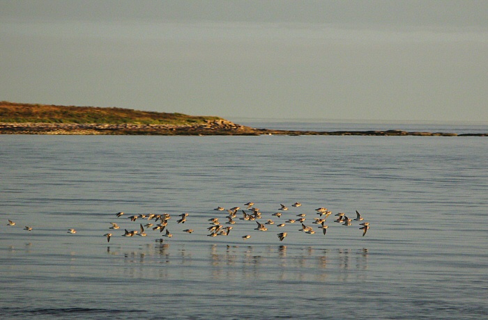 Full ebbtide at sunset. Wind died down, water went still. Skimming the surface, flocks of shorebirds twisted and rose and hurried from one place to another and back again, flashing wings in the setting sun.