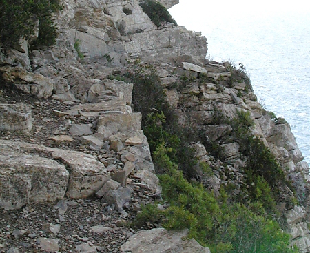 The terrain was very rugged, the paths dangerous. They were the most difficult I have ever hiked. Here is one, if you can distinguish it, winding through the center of the photo. Clearly, a misstep would be bad news. In places I had to climb with both hands and feet up over rock faces.